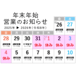 - 年末年始の営業について年末年始は下記の通り休業とさせていただきます 12月30日(火)17時終了12月31日(水)~1月4日(日)休… 続きを読む: 年末年始の営業について