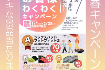 今月の上野薬局では冬のわくわくキャンペーンを開催中です。 お買い上げ3000円ごとに専用応募ハガキをお渡しており、抽選でステキな景品が当たります。ハズレた方にも1000円分のJCBギフトカードが当たるダブルチャンスもあり!期間は2/28(火)までです。... -